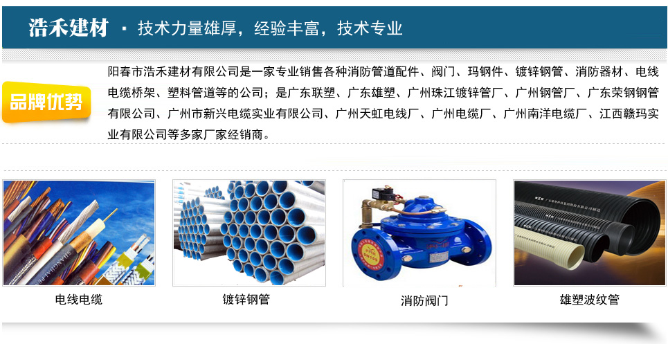 陽春市浩禾建材有限公司是一家專業(yè)銷售各種消防管道配件、閥門、瑪鋼件、鍍鋅鋼管、消防器材、電線電纜橋架、塑料管道等的公司;是廣東聯(lián)塑、廣東雄塑、廣州珠江鍍鋅管廠、廣州鋼管廠、廣東榮鋼鋼管有限公司、廣州市新興電纜實業(yè)有限公司、廣州天虹電線廠、廣州電纜廠、廣州南洋電纜廠、江西贛瑪實業(yè)有限公司等多家廠家經(jīng)銷商。